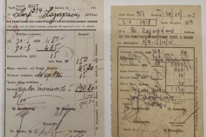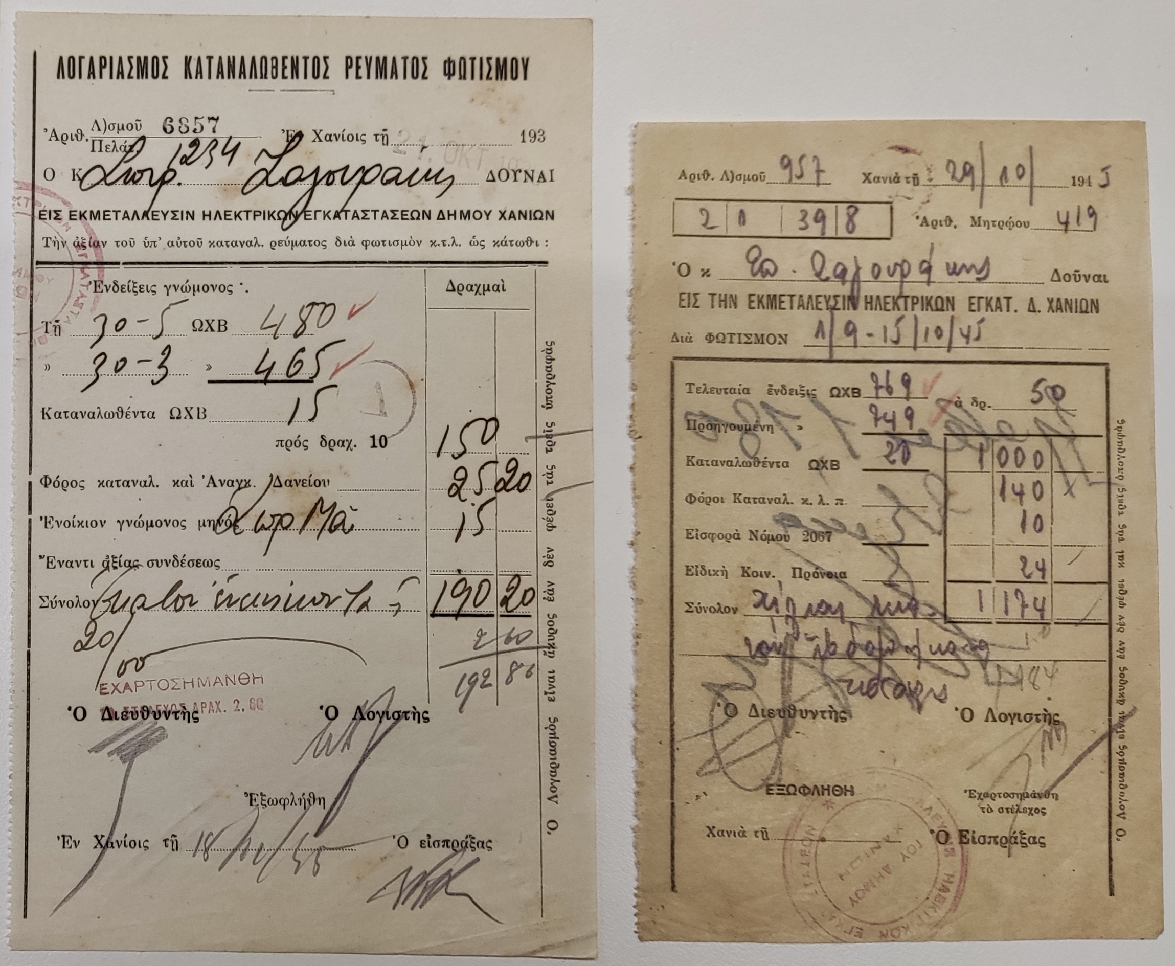Και οι τρεις λογαρισμοί έχουν πλαγίως δεξιά την κάθετη σημείωση “Ο Λογαριασμός είναι άκυρος εάν δεν φέρει τας τρεις υπογραφάς”, εννοώντας του Διευθυντή, του Λογιστή και του Εισπράκτορα! Και στους τρεις λογαριασμούς αυτός που πληρώνει είναι ο κ. Σπύρος Ζαγουράκης, πιθανόν επιχειρηματίας στο κέντρο των Χανίων και μάλιστα ο ένας λογαριασμός που αναφέρει ως φορέα την “Επιτροπήν Προσωρινής Εκμεταλλεύσεως Υδροηλ- Έργων Δήμου Χανίων” (27 Μαϊου 1929) έχει κάτω δεξιά επικολλημένο γραμματόσημο της μίας Δραχμής!